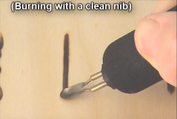 Carbon buildup on the tip affects the temperature of the tip. Lora S. Irish’s website, www.carvingpatterns.com, has terrific woodburning tips and advises you to lay fine grit sandpaper on a glazed tile surface and quickly pull the tip across the paper. It not only removes the carbon, but also sharpens the tip.