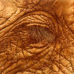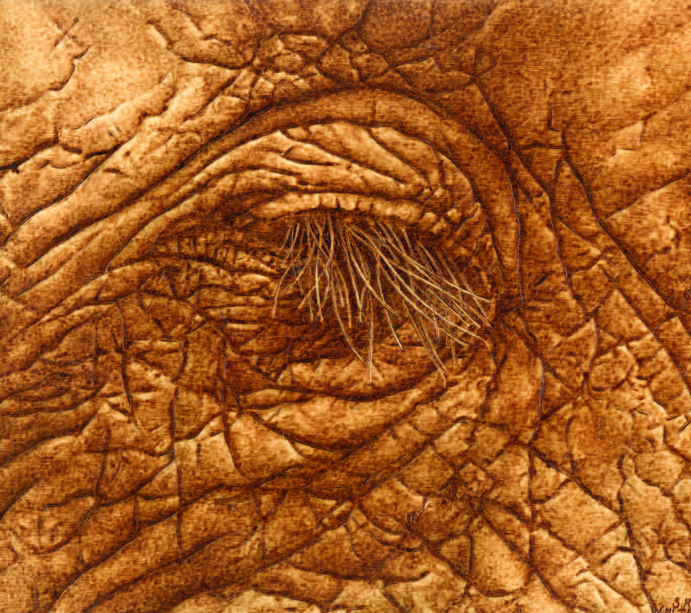 - Elephant Eye, monochrome pyrography on birch plywood.