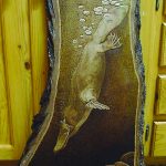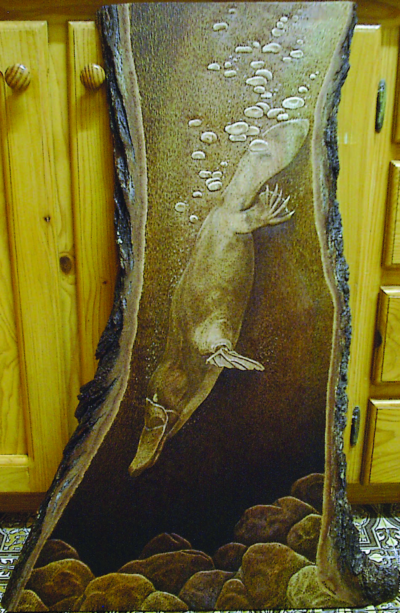 - Platypus Diving, monochrome pyrography on silky oak.