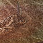 - Turtle Rising monochrome pyrography on relief carved silky oak.